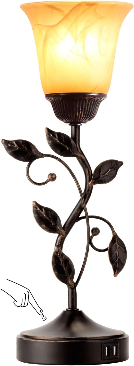 Touch Control Table Lamp with 2 USB Charging Ports, 3-Way Dimmable Bedside Nightstand Lamps, Amber Glass Shade Vintage Rural Leaf Lamp for Living Room, Bedroom, Dresser, LED Bulb Included (Bronze)